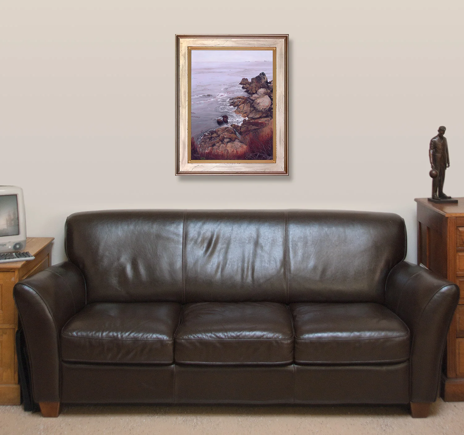 The well-worn rocks captured in subtle warm browns and neutral silver colors, accented by the swirling tide pools in the indigo water of a cold, overcast day, sets a calm mood in the room where the painting hangs.