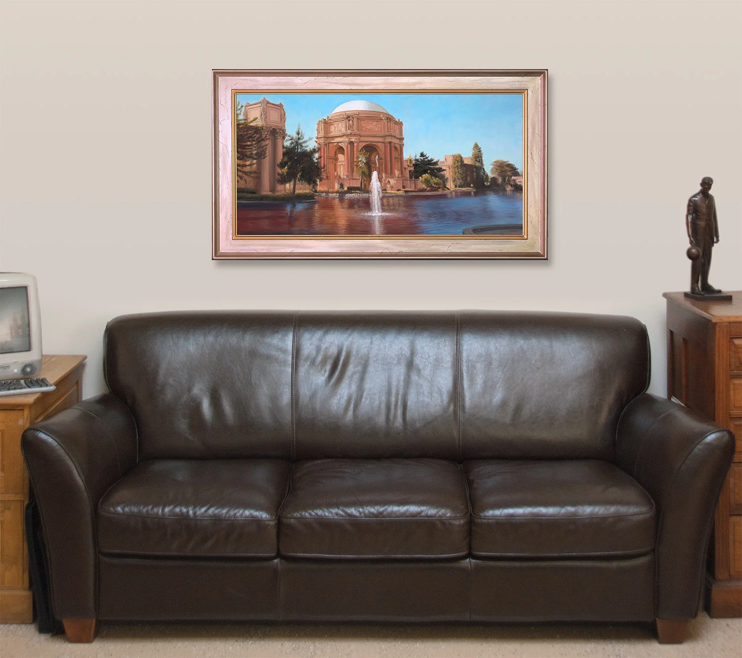 A vista oil painting of the Palace of Fine Arts, in San Francisco California, portrayed from the far side of the lagoon.