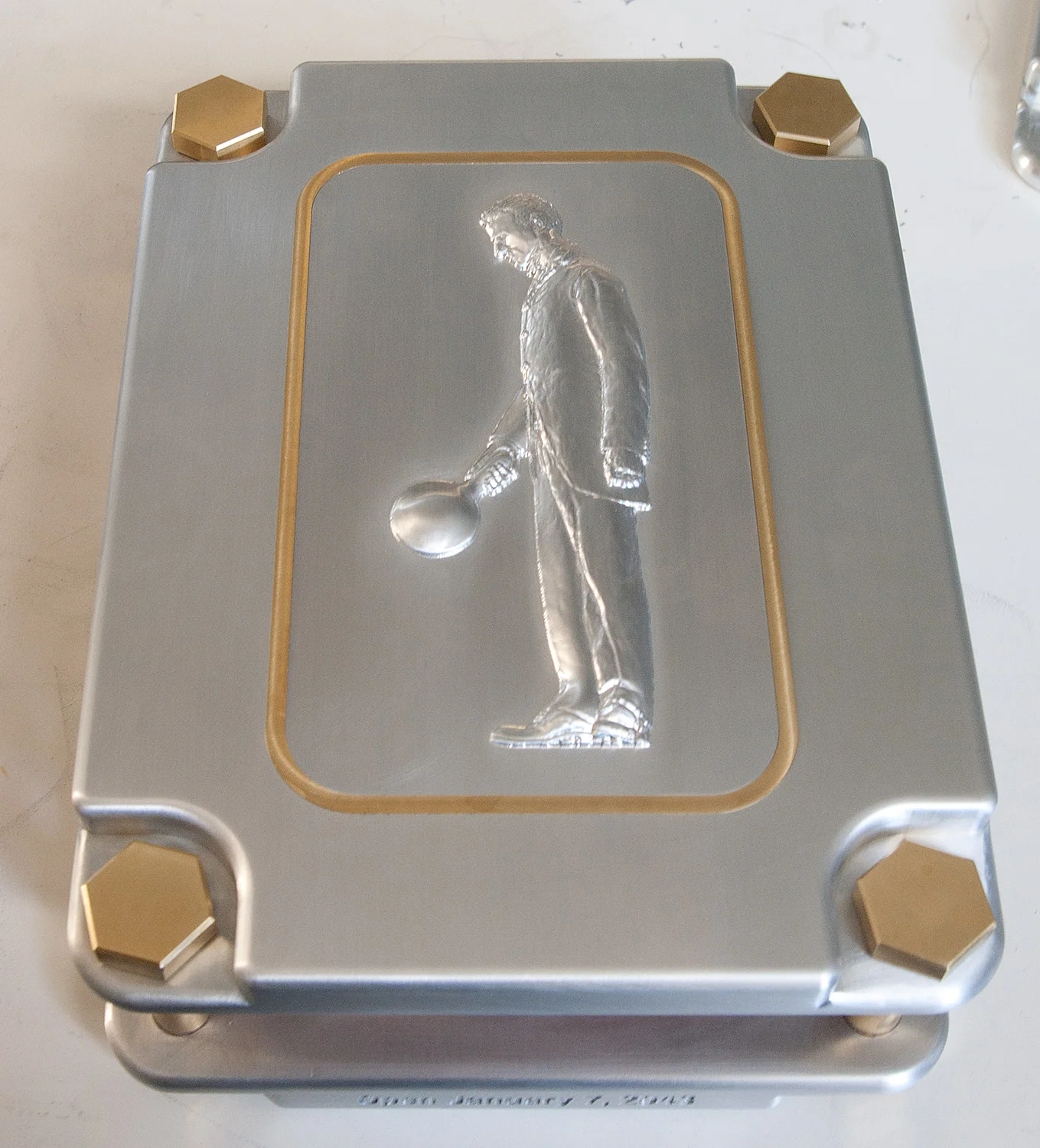 The bas relief on the cover of the time capsule: ScanSite was able to create a bas relief STL file from the 3D data they captured scanning of my 7ft clay sculpture. The data was used by the machinist to CNC mill the image out of a plate of aluminum made to fit perfectly into the brass surrounded section of the time capsule lid.